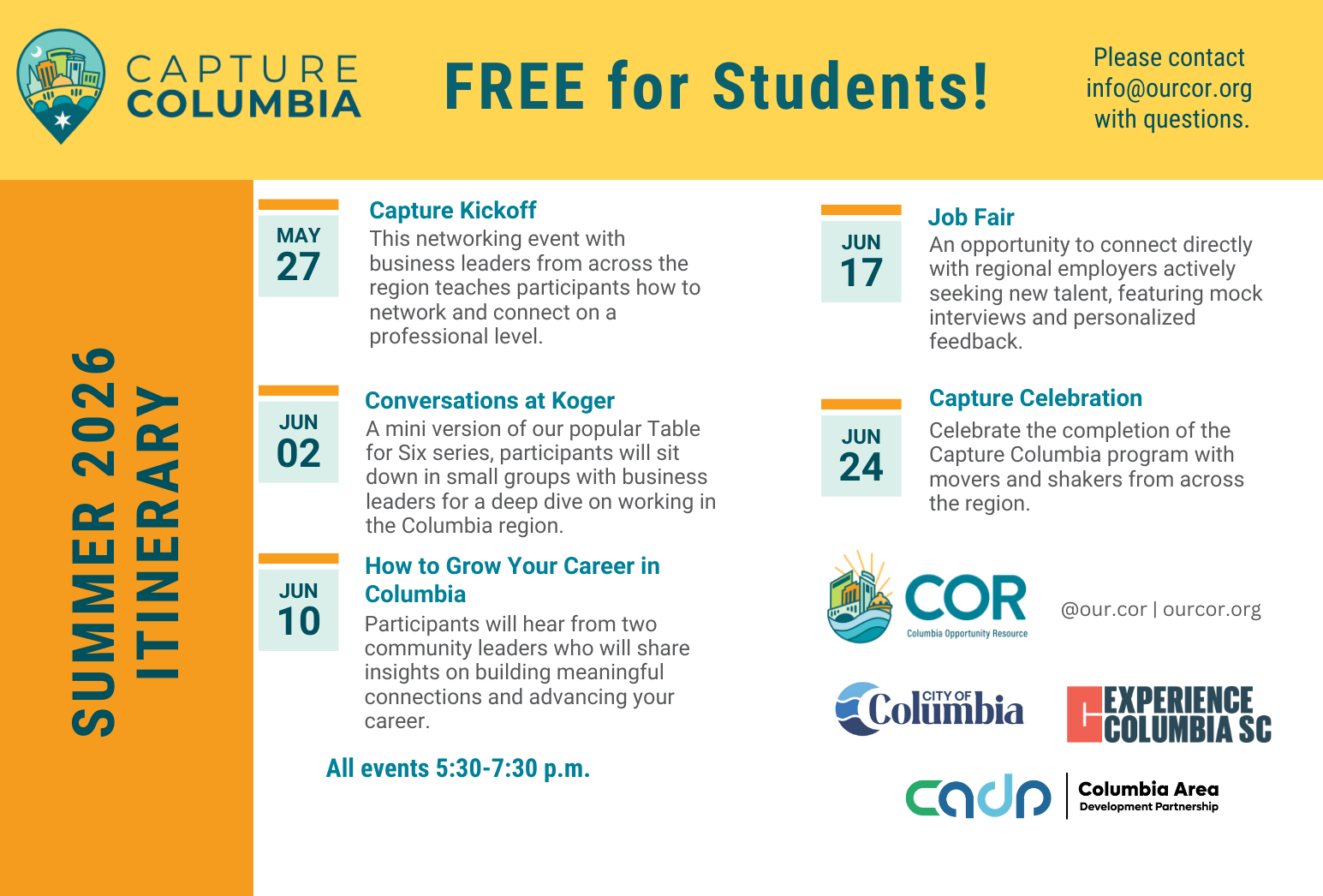 Capture Columbia is a program designed for college students, summer associates at companies, and recent graduates in the Columbia area to take a deep dive into the community while building personal and professional relationships that may help land jobs and build careers. Best of all– Capture Columbia is completely FREE.